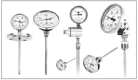 測量氣體和液體的溫度。與玻璃溫度計相比,它具有無(wú)汞損壞、讀數清晰、堅固耐用的優(yōu)點(diǎn)。我生產(chǎn)多用途雙金屬溫度計,規格品種齊全,質(zhì)量穩定可靠,可廣泛應用于工業(yè)、農業(yè)、國防和科研領(lǐng)域的各個(gè)部門(mén)。雙金屬溫度計結構特點(diǎn)和工作原理雙金屬 溫度計(以下簡(jiǎn)稱(chēng)溫度計)使用螺旋加熱器雙金屬板作為溫度傳感元件,并將其安裝在保護套中,一端固定(固定端),另一端(自由端)連接到薄軸上,軸端帶有指針。當溫度變化時(shí),溫度傳感元件的自由端立即旋轉,并通過(guò)細軸驅動(dòng)指針以指示刻度盤(pán)上的溫度變化。直行溫度計通過(guò)轉向傳動(dòng)機構驅動(dòng)指針。外殼材料包括鋼板、鑄造鋁合金和不銹鋼板??烧{角度溫度計的頭部可借助波紋管、轉角機構和其他部件從角度調整為直線(xiàn)或從直線(xiàn)調整為角度。