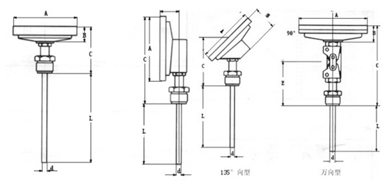 3、135°向型雙金屬溫度計:指針盤(pán)與保護管成135°連接;